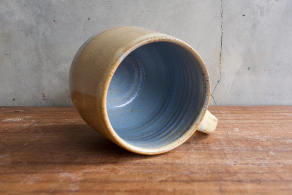 Thrown on the wheel in Bennett's Filtered Stoneware, this mug is glazed matte blue on the inside, and half yellow, half sea foam on the outside.