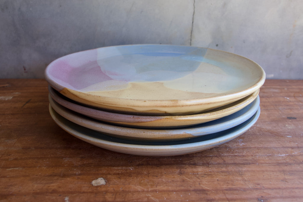 Thrown on the wheel in Bennett's stoneware clay, and dipped in 4 pastel colours which overlap and react with each other creating a beautiful and unique colour pattern on each plate. Each plate may look slightly different from the photographs.