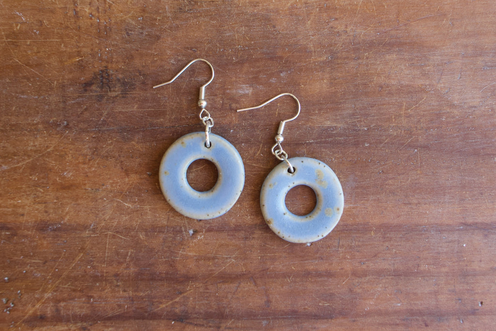 These ceramic earrings are made from a speckled stoneware clay, and have an opaque blue glaze on the front side. The speckle in the clay means that the glaze has some variation. A beautiful pop of sky blue. They are not glazed on the back.