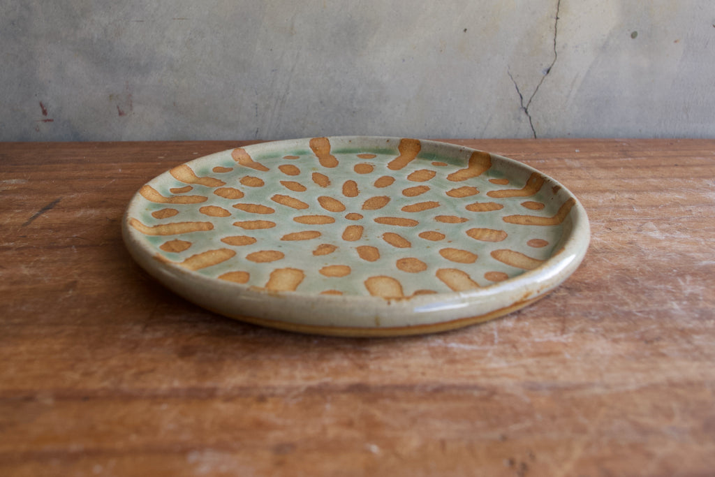 This dish has been decorated with a wax resist, leaving a pattern of raw clay in the green glaze. This is a perfect little jewellery catch all, or could make a lovely soap dish.