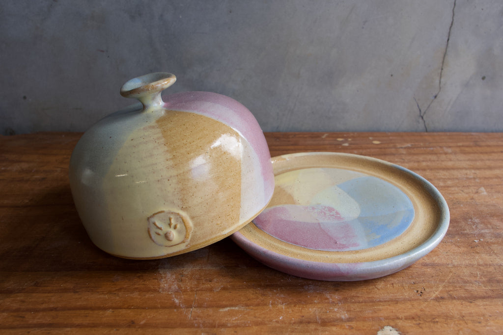 The rainbow butter dish is made from Bennett's filtered stoneware and glazed in 4 different glazes which overlap to create a rainbow of colour. This is a bright and happy dish to keep your butter in. The lid is fully glazed except for the rim which sits on the unglazed ring of the plate below. The knob is moulded by hand and has an undulating, organic shape.