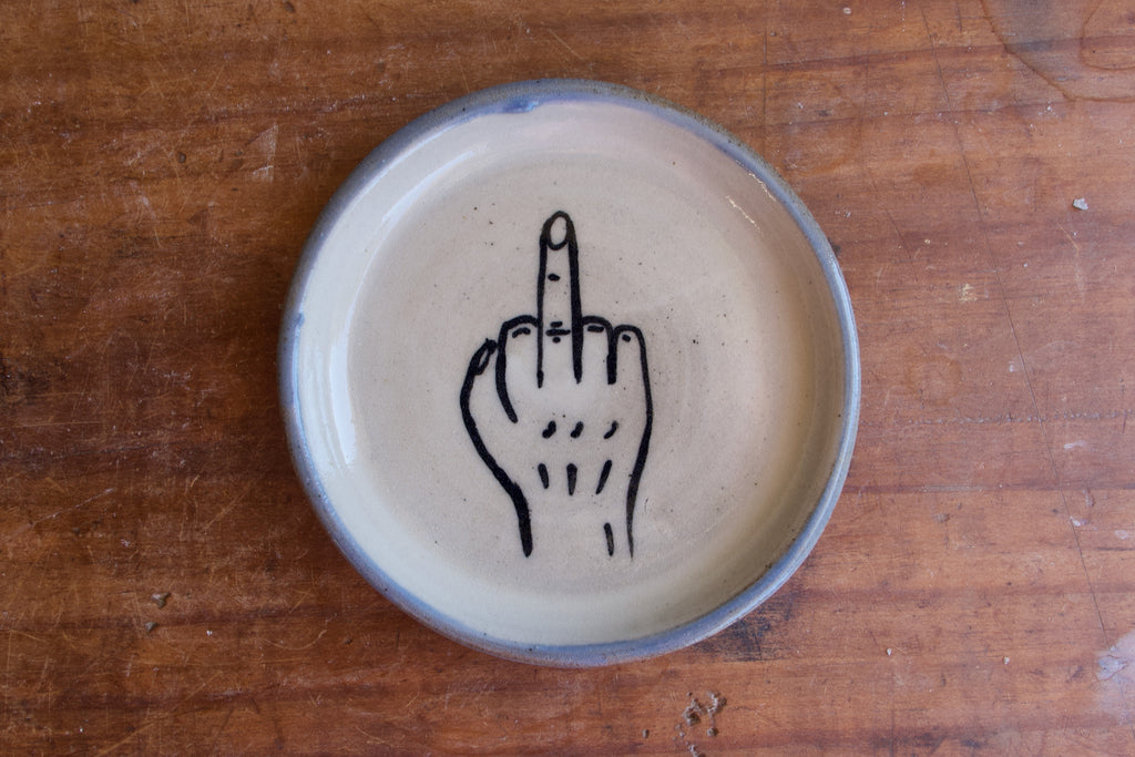 Thrown on the wheel and then decorated with underglaze slip. The flipping bird hands are painted by hand so each piece will have slight variation.