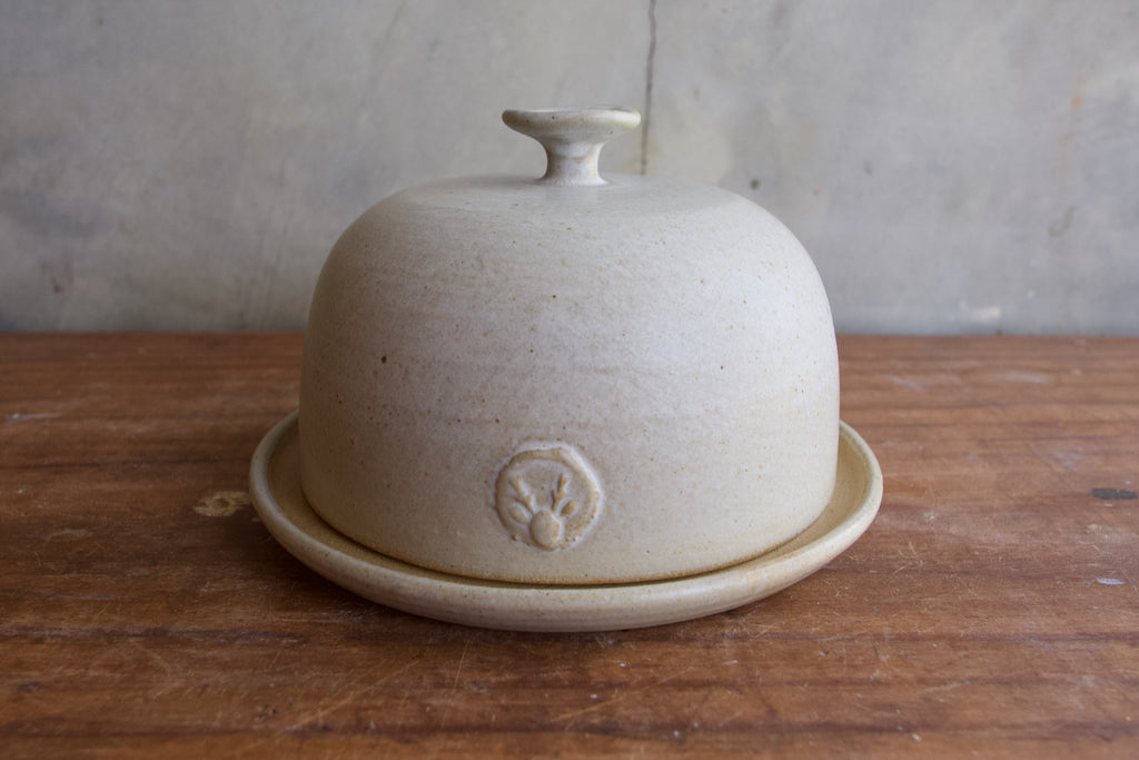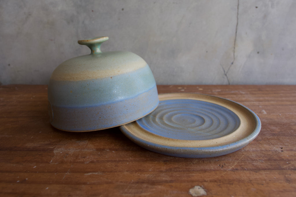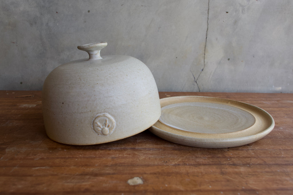 The butter dish is thrown on the wheel, with a hand moulded knob on the top. The cloche sits in an unglazed groove on the base.
